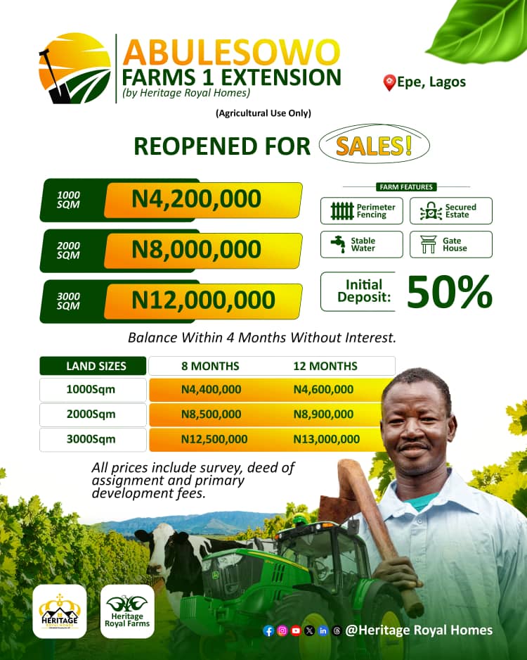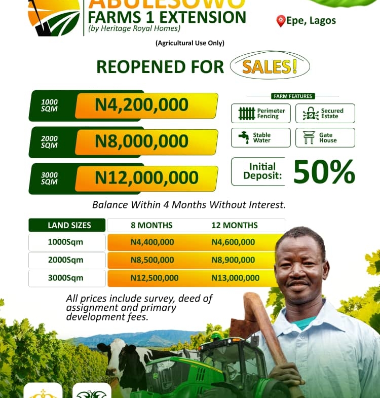If your answer is YES, this is your opportunity to invest in Abulesowo Farms, supported by Heritage Royal Homes.